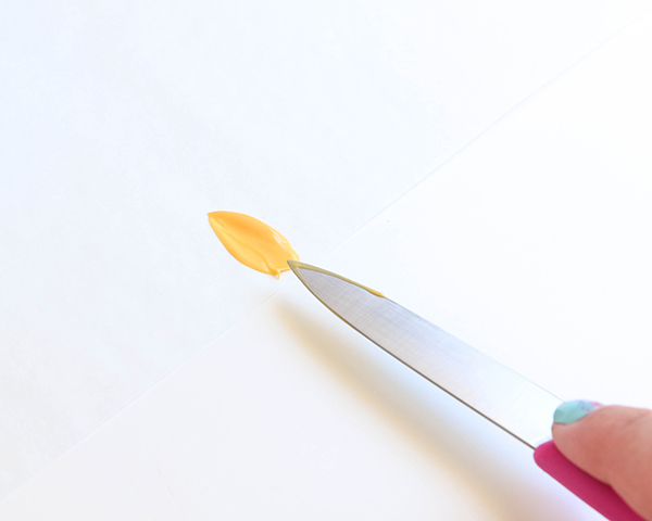 Dip an inch or so of a flat side of the pairing knife into the melted chocolate. Lay the coated portion of the knife against the edge of a sheet of parchment paper. Smear the chocolate on the paper, pulling the knife down and away.